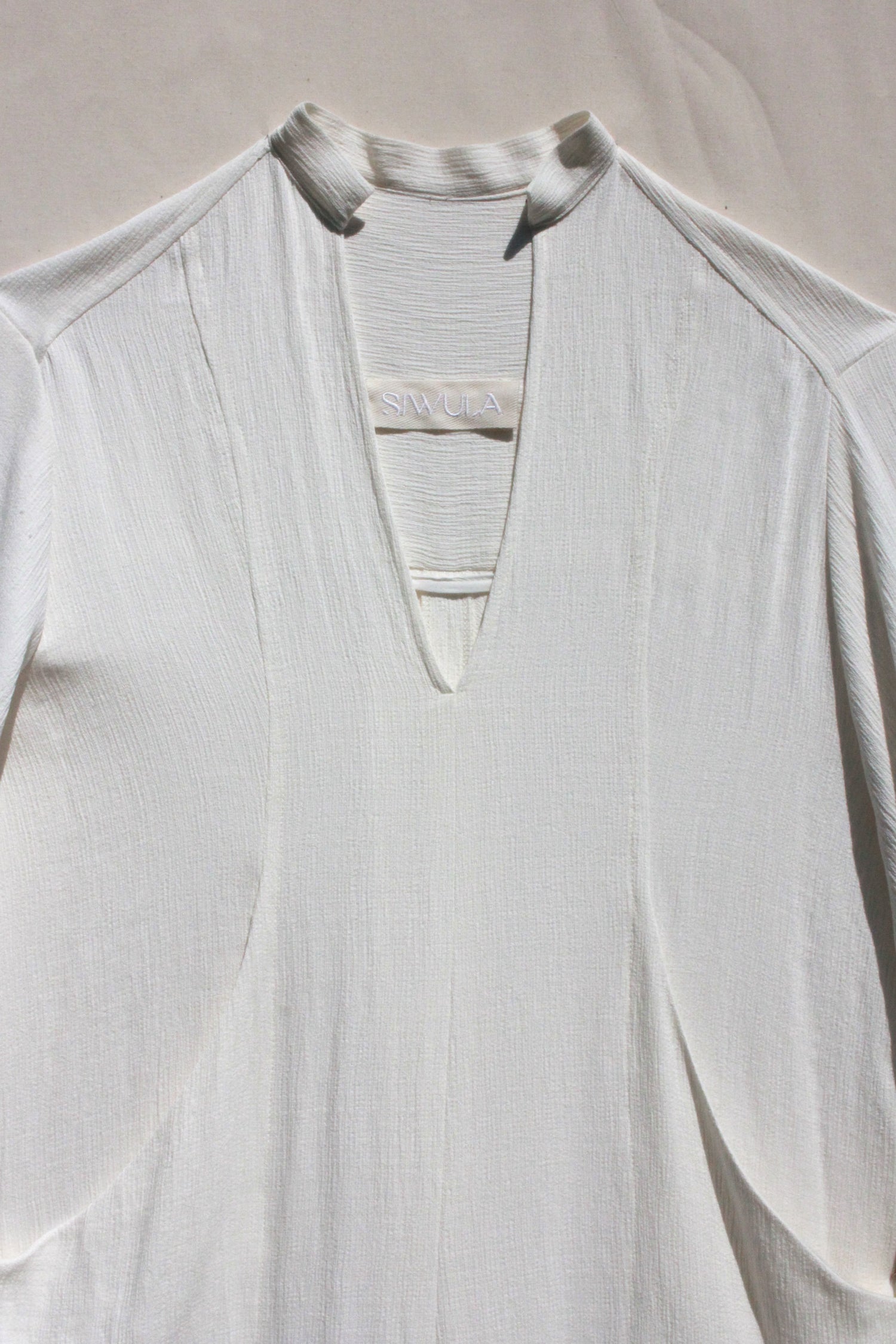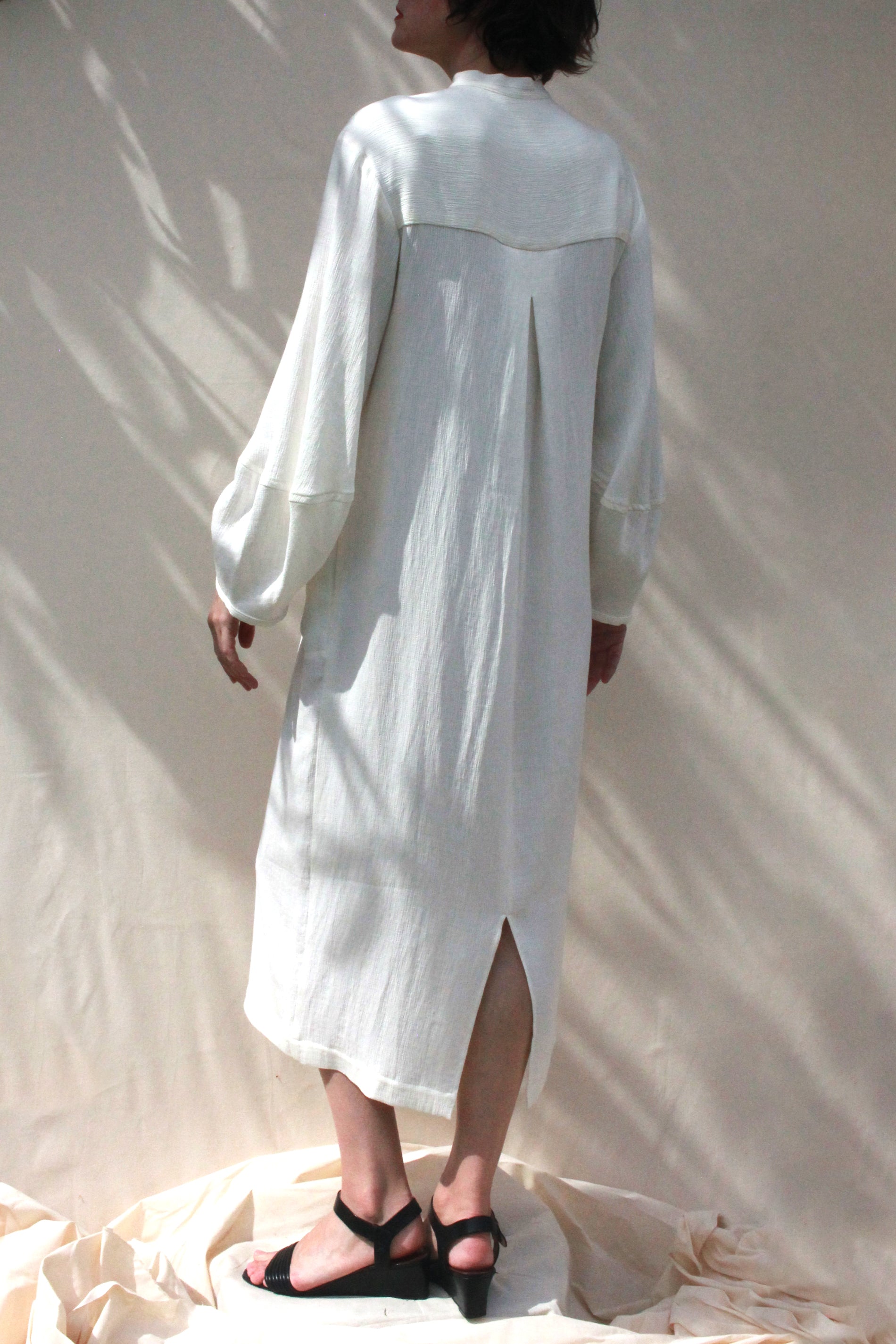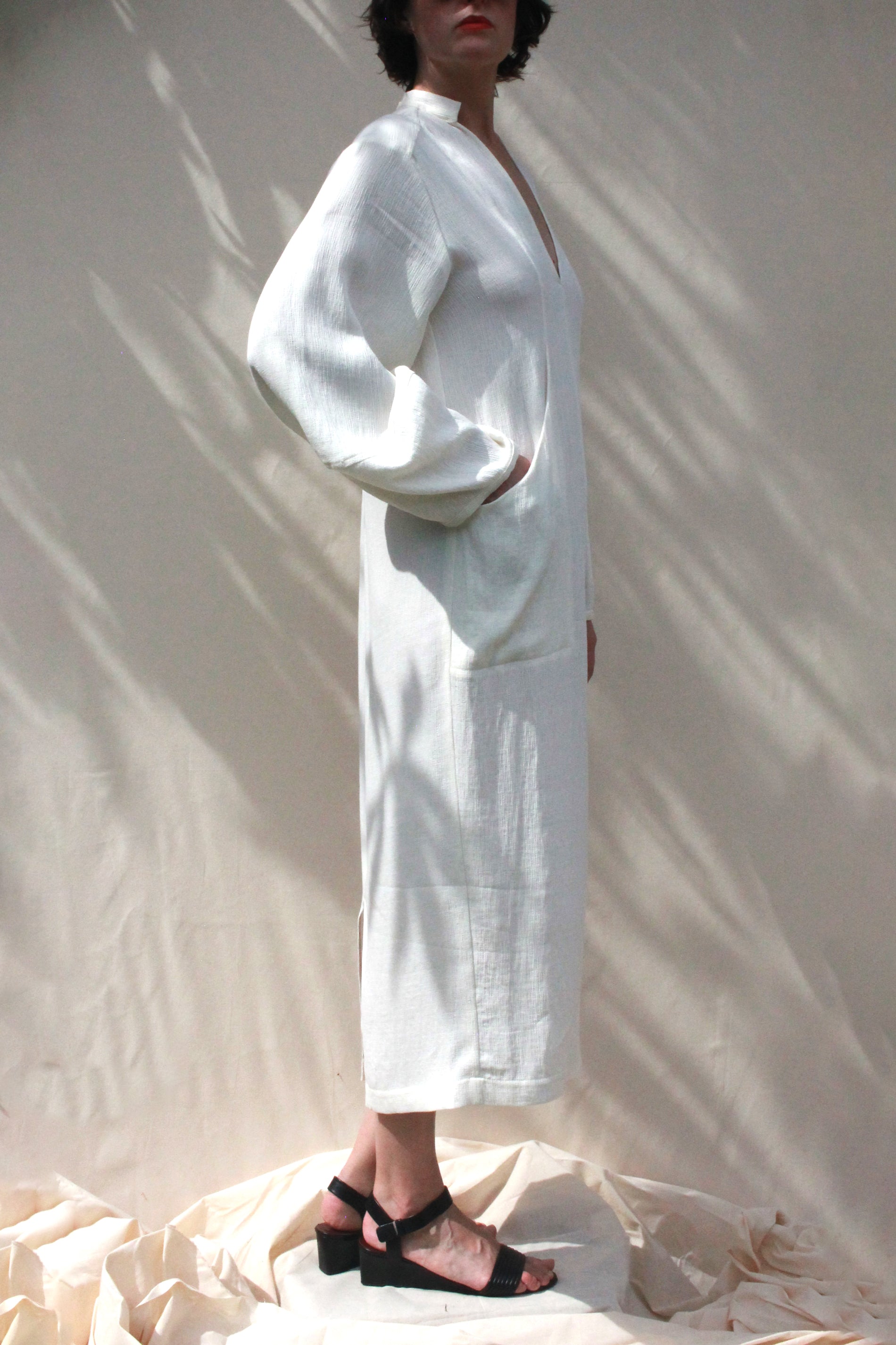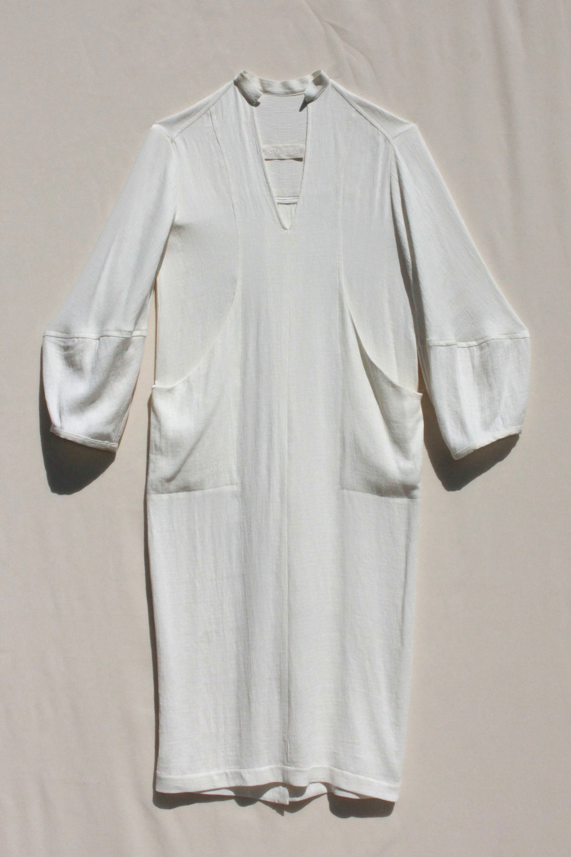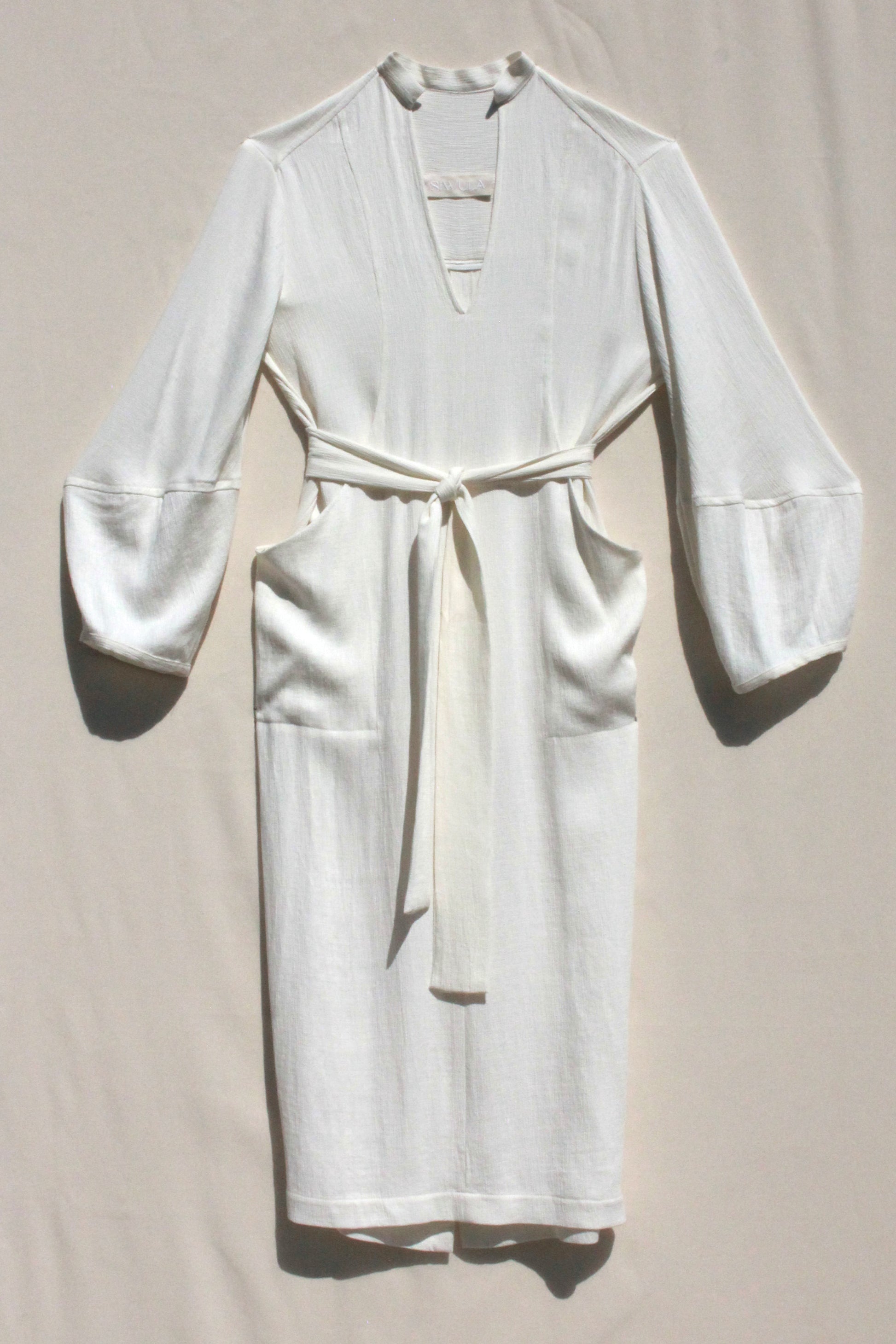 A recut of our favorite dress in a new fabric. Features a micro collar, open neckline, exaggerated pockets & sleeves, plus a robe style belt. This dress is a continuation of our exploration of feminine strength; in this softer fabrication the strong sculptural details become a soft drape.