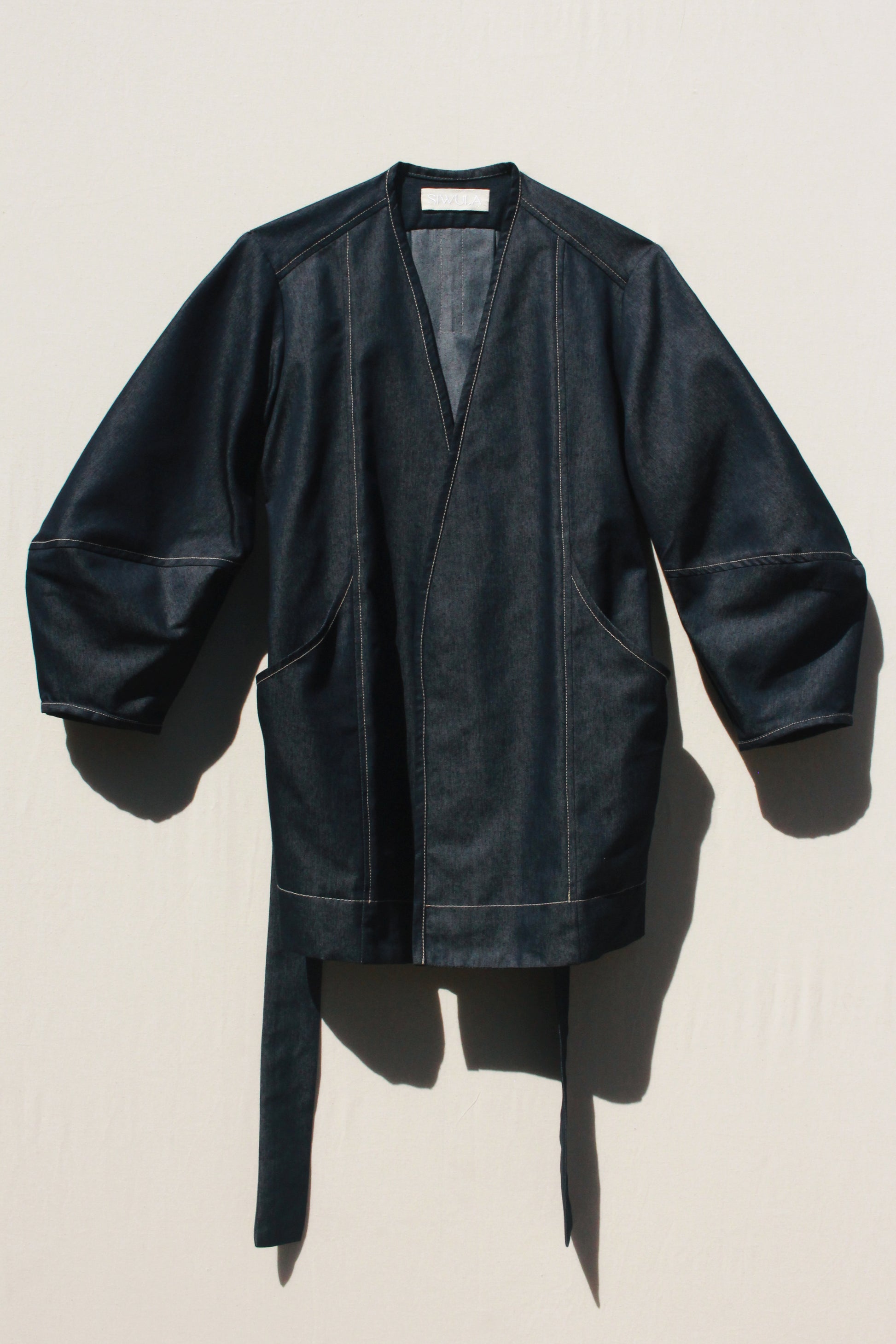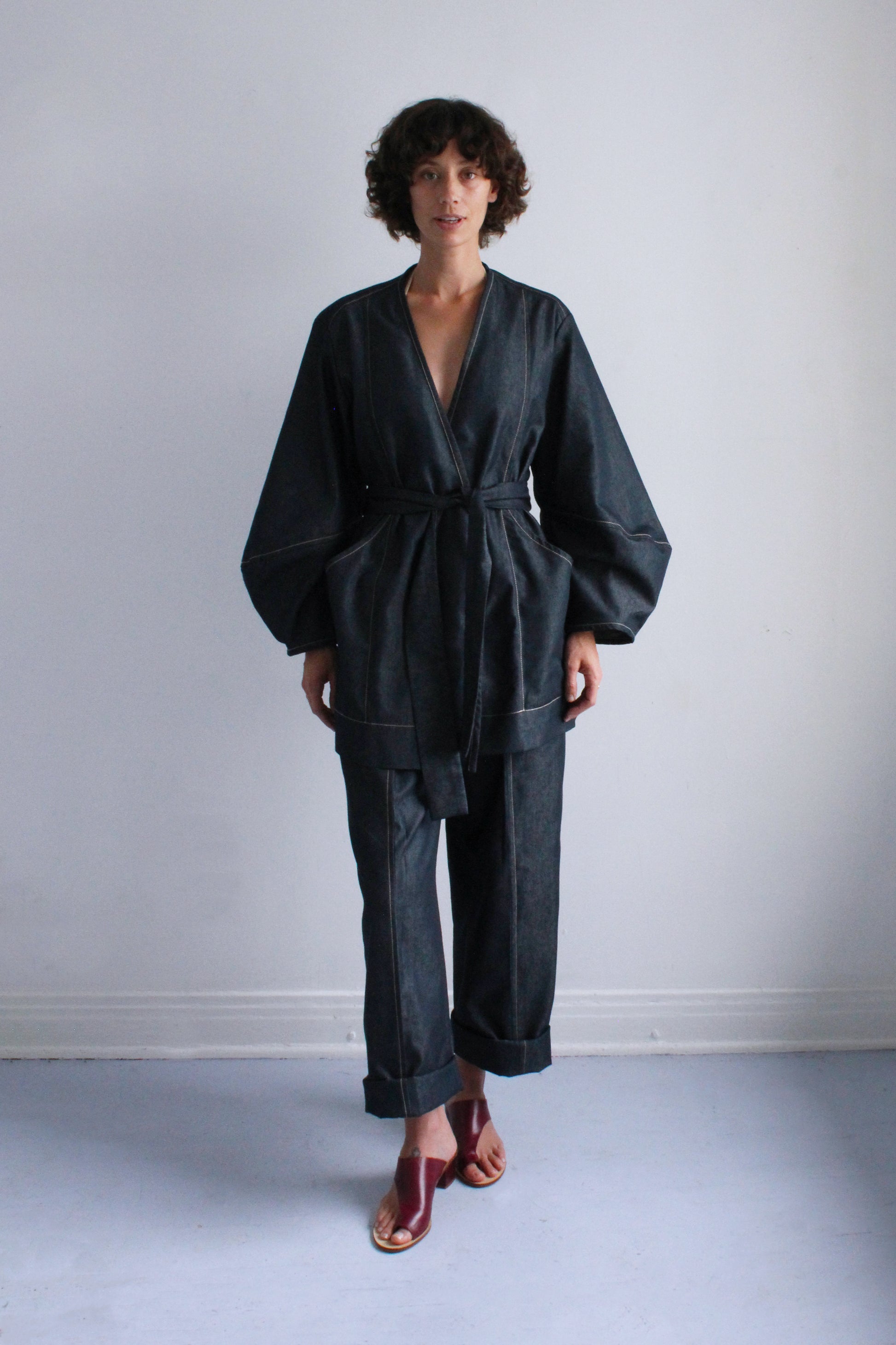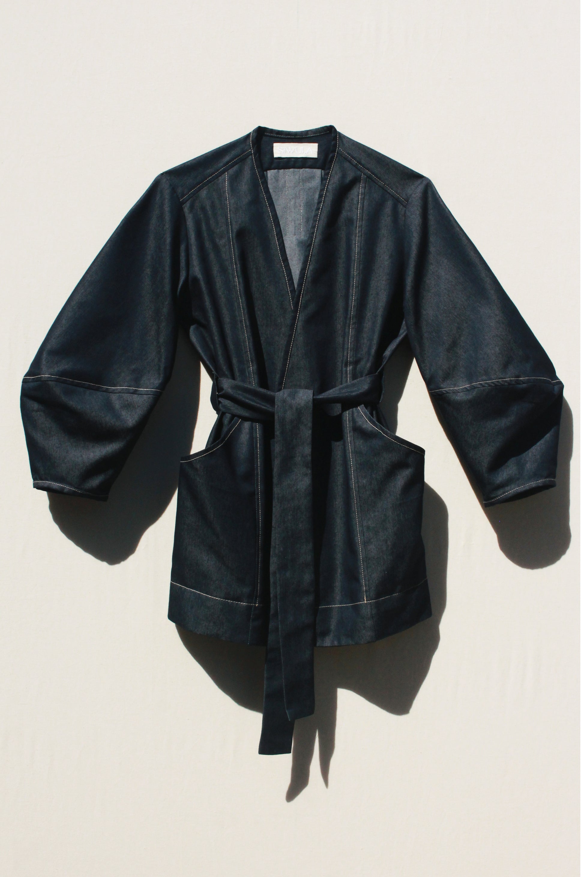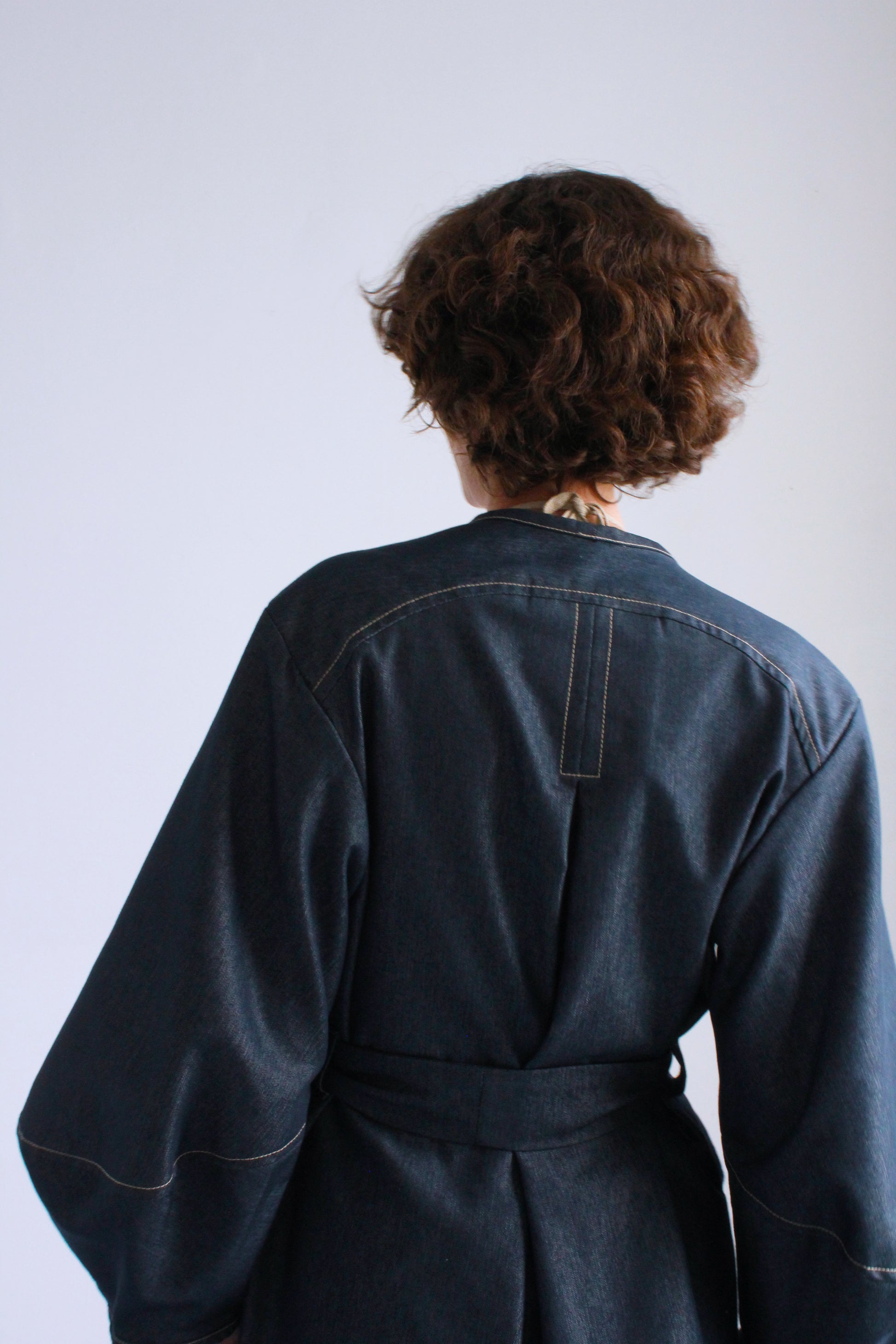 An easy throw on piece for an instantly elevated look. Features the same sculptural sleeve and stand away pocket as the Scoop Pocket Dress, with an exaggerated back yoke curve, detachable belt, cross-over robe style front, and all over contrast stitching.