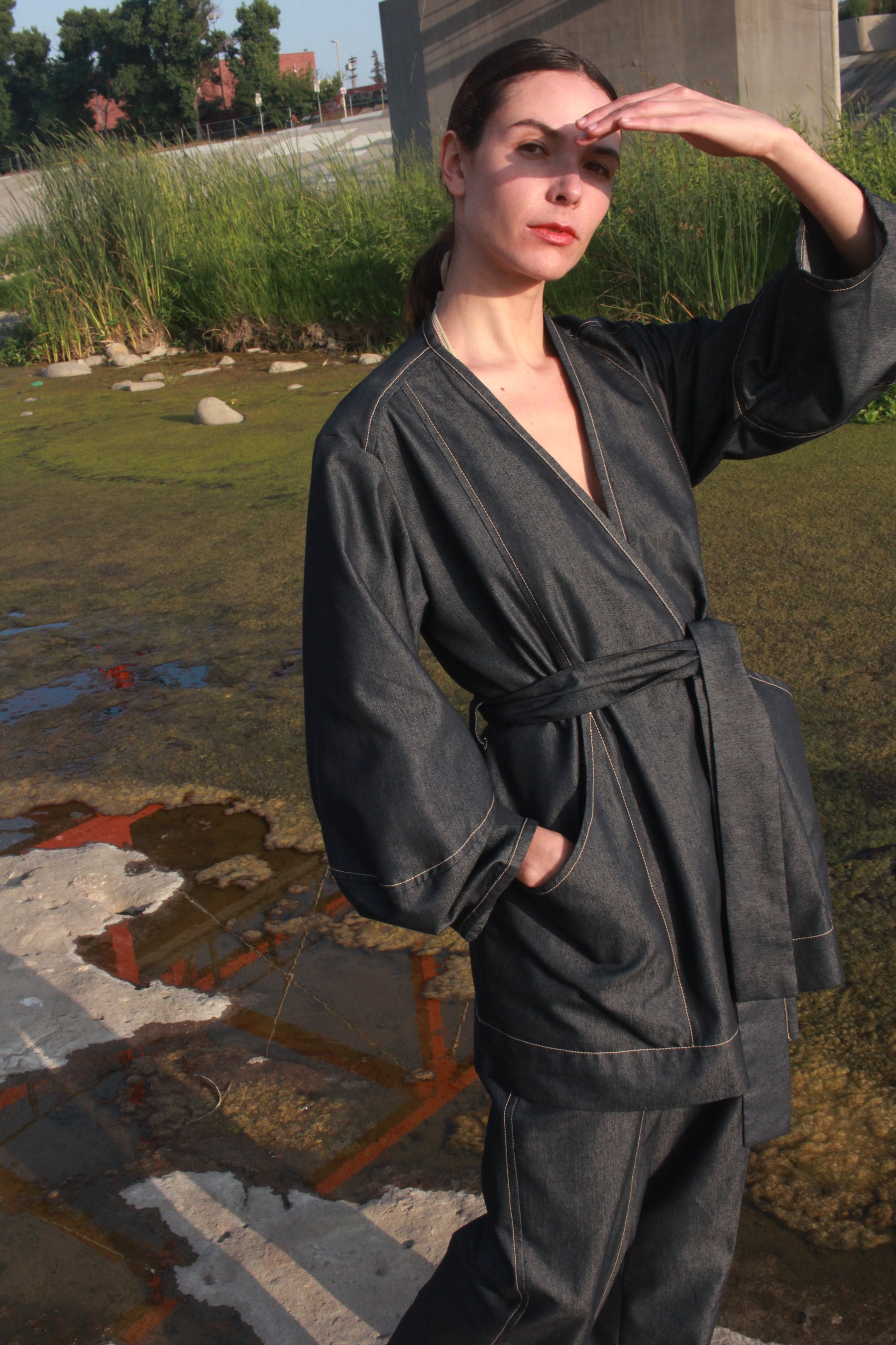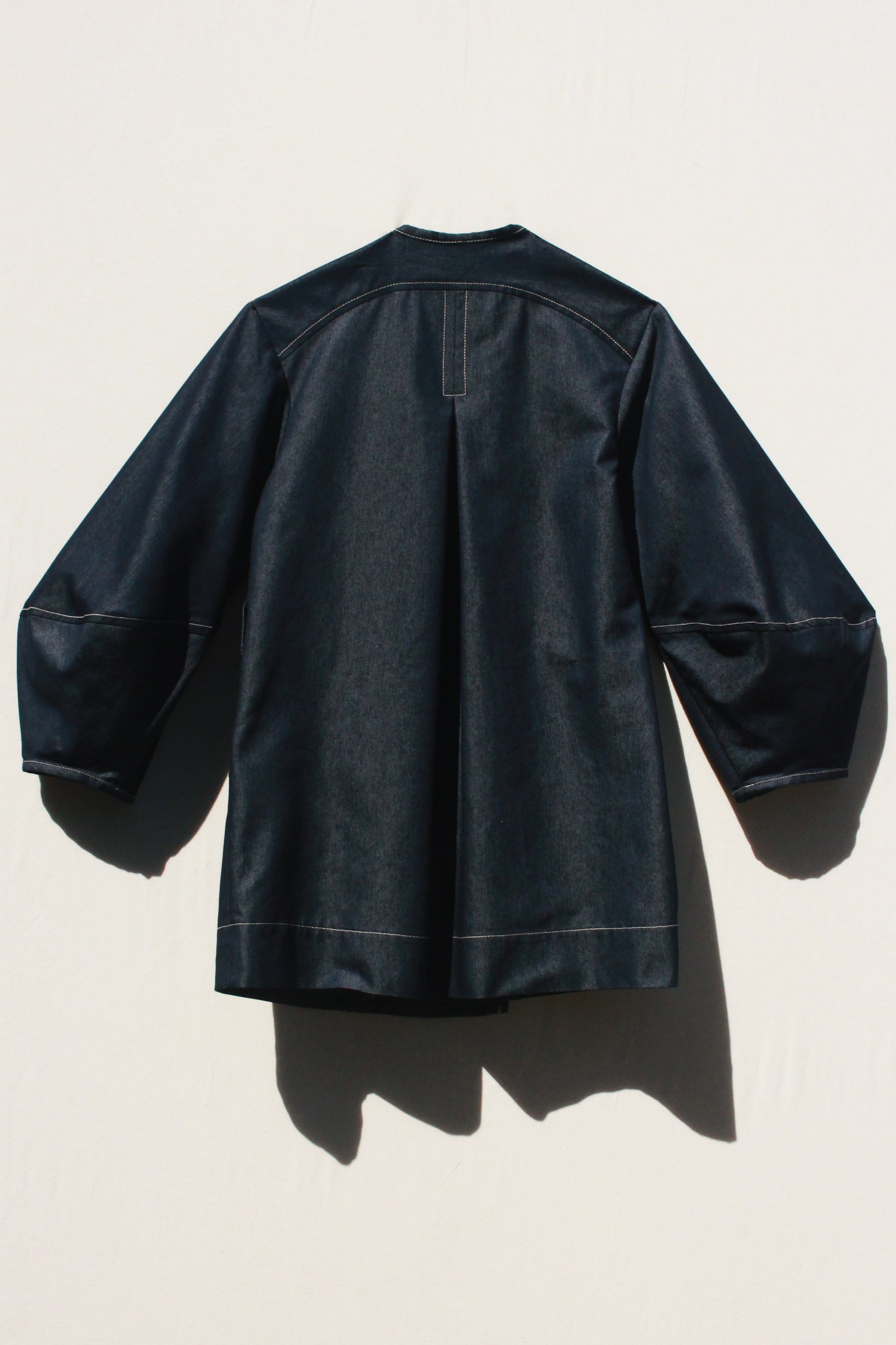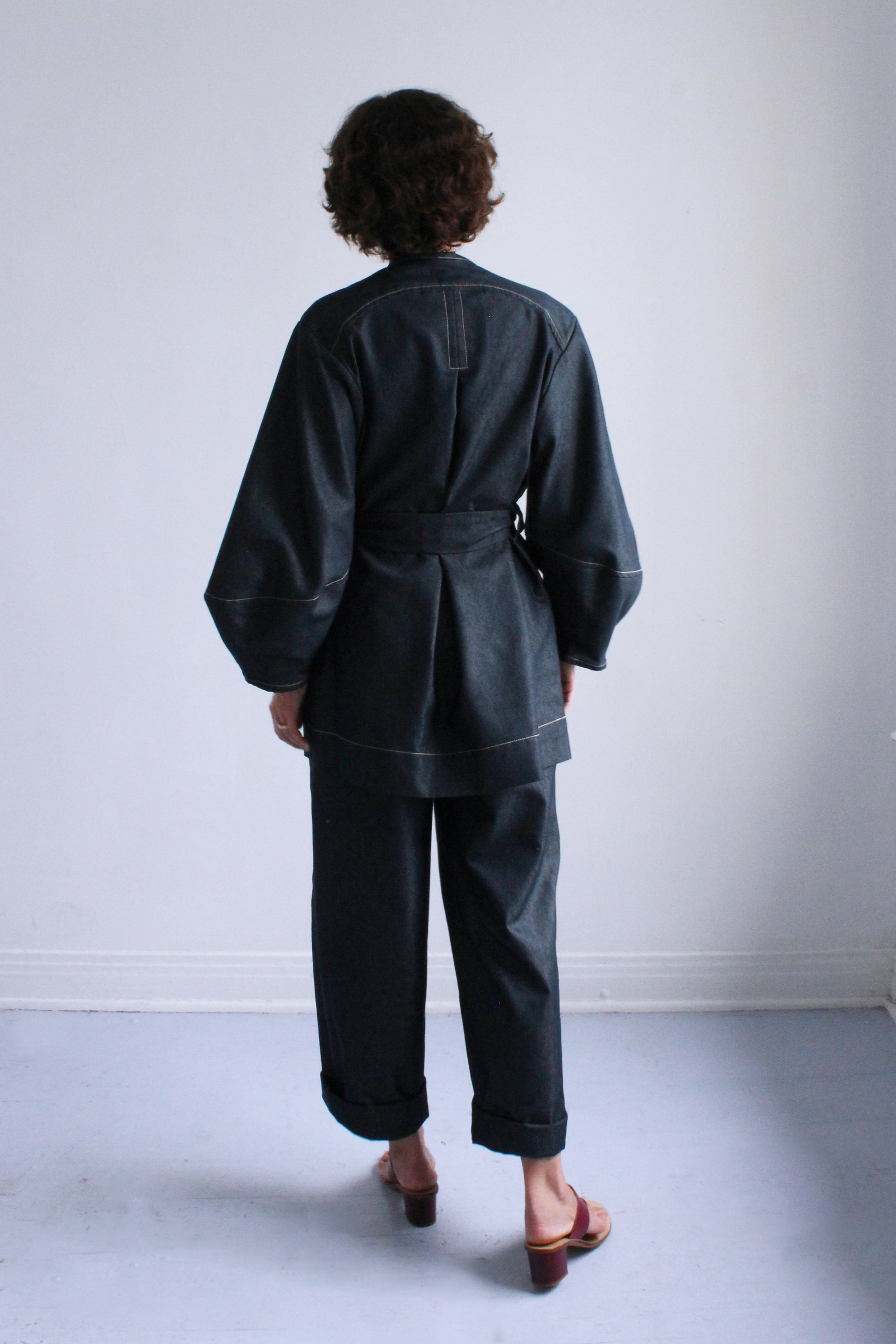 An easy throw on piece for an instantly elevated look. Features the same sculptural sleeve and stand away pocket as the Scoop Pocket Dress, with an exaggerated back yoke curve, detachable belt, cross-over robe style front, and all over contrast stitching.