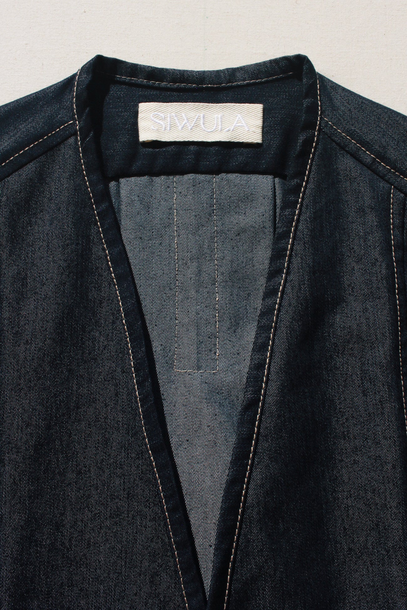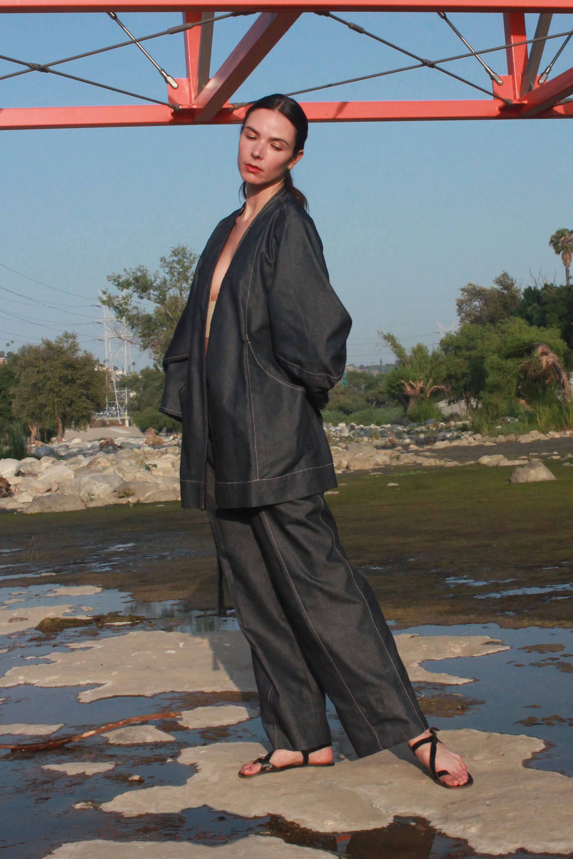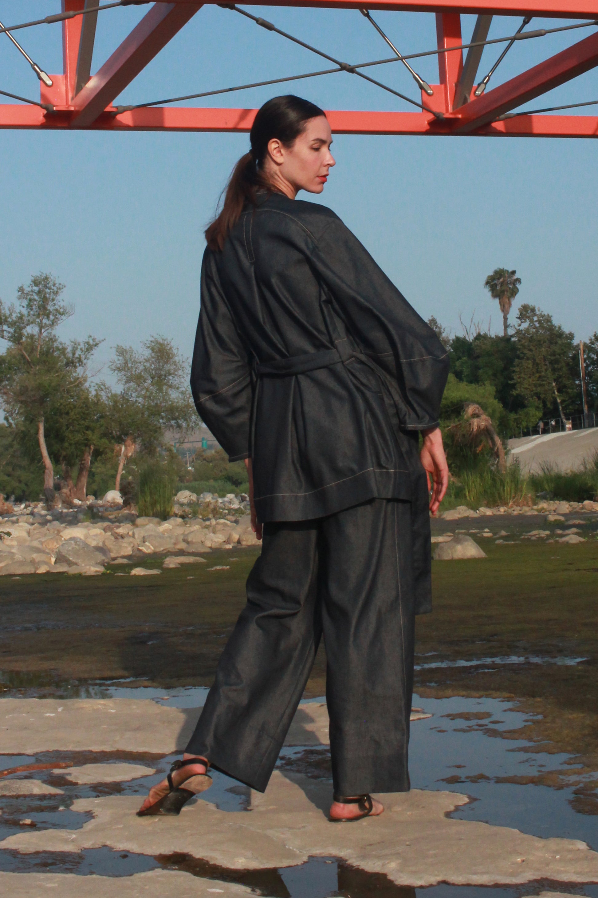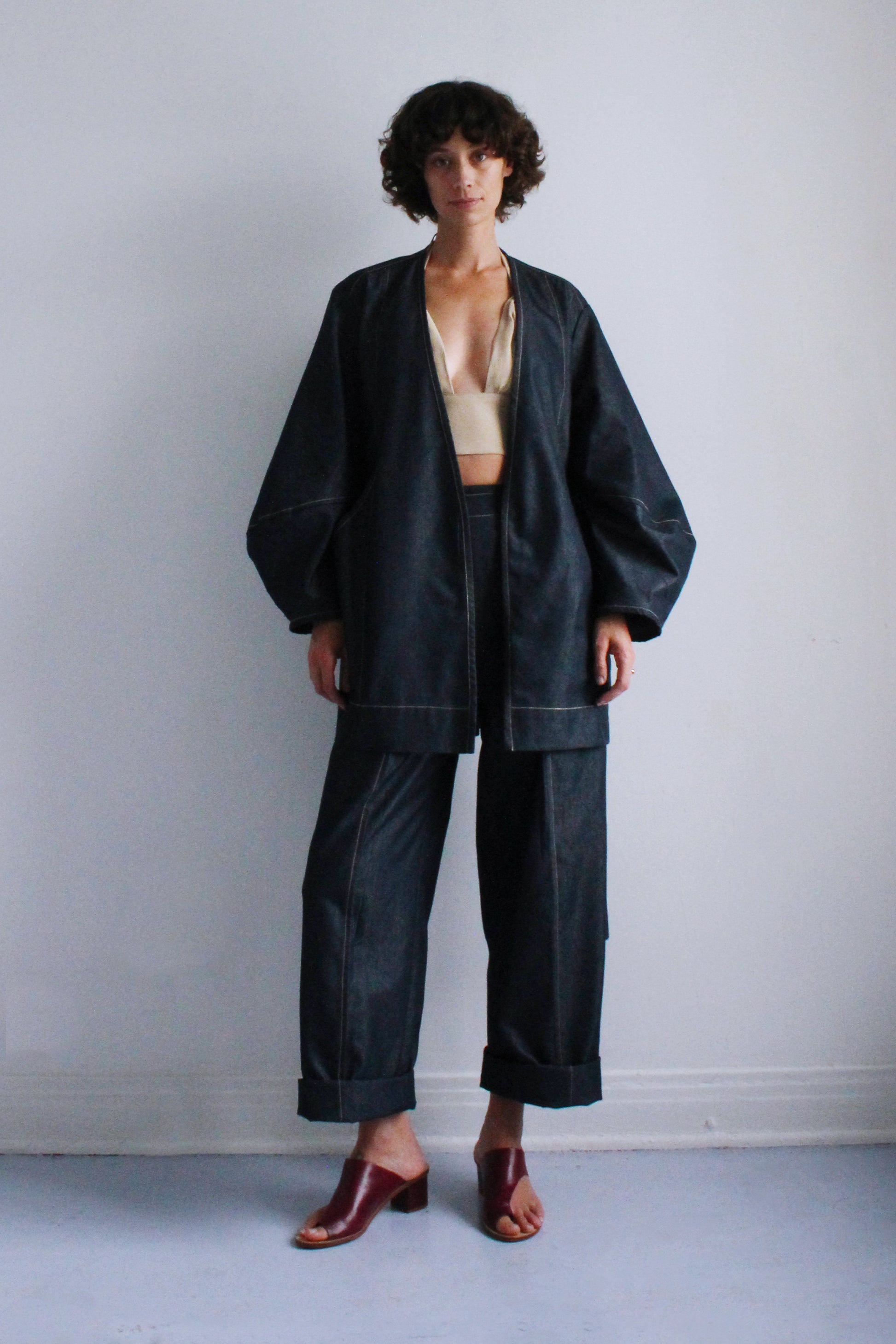 An easy throw on piece for an instantly elevated look. Features the same sculptural sleeve and stand away pocket as the Scoop Pocket Dress, with an exaggerated back yoke curve, detachable belt, cross-over robe style front, and all over contrast stitching.