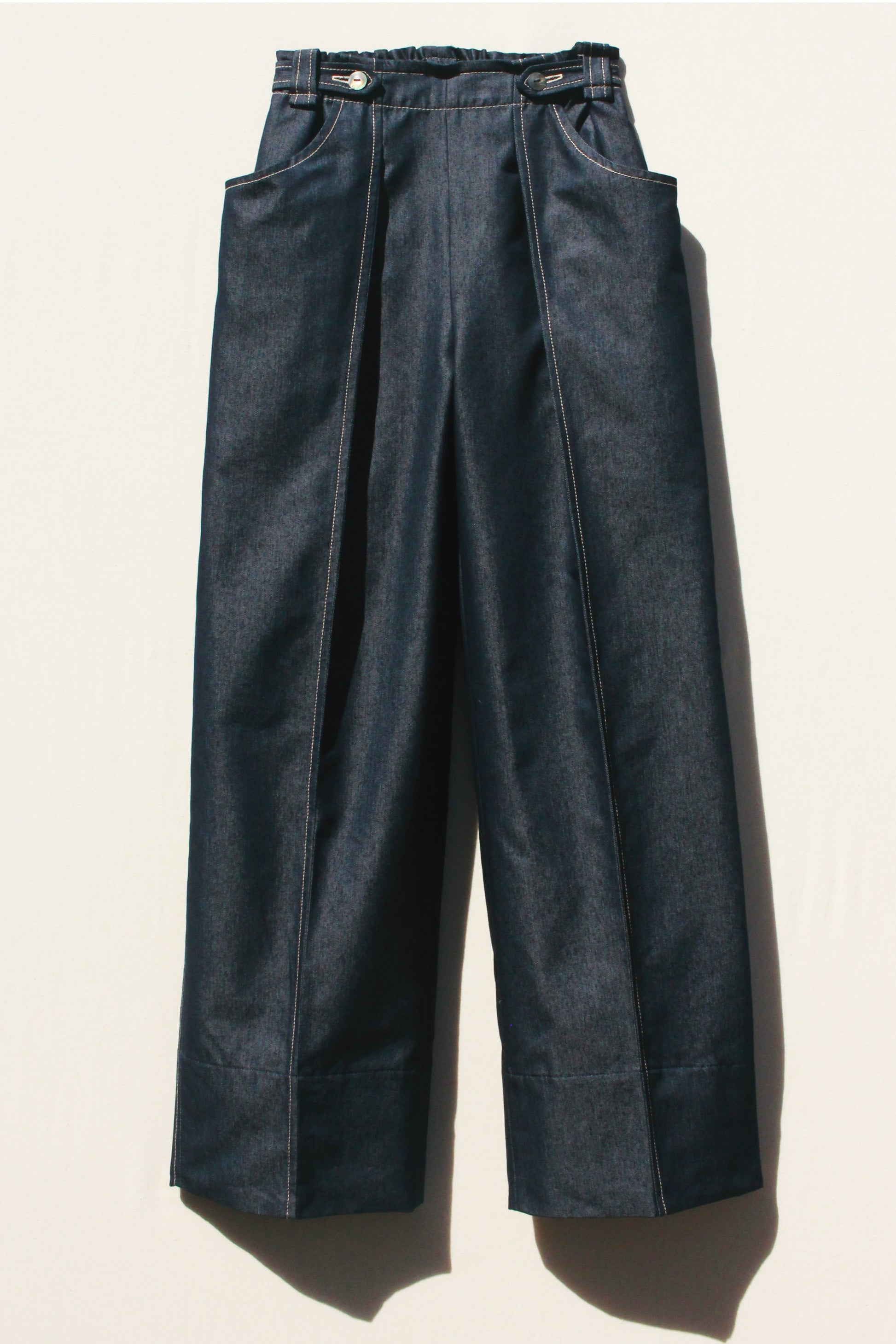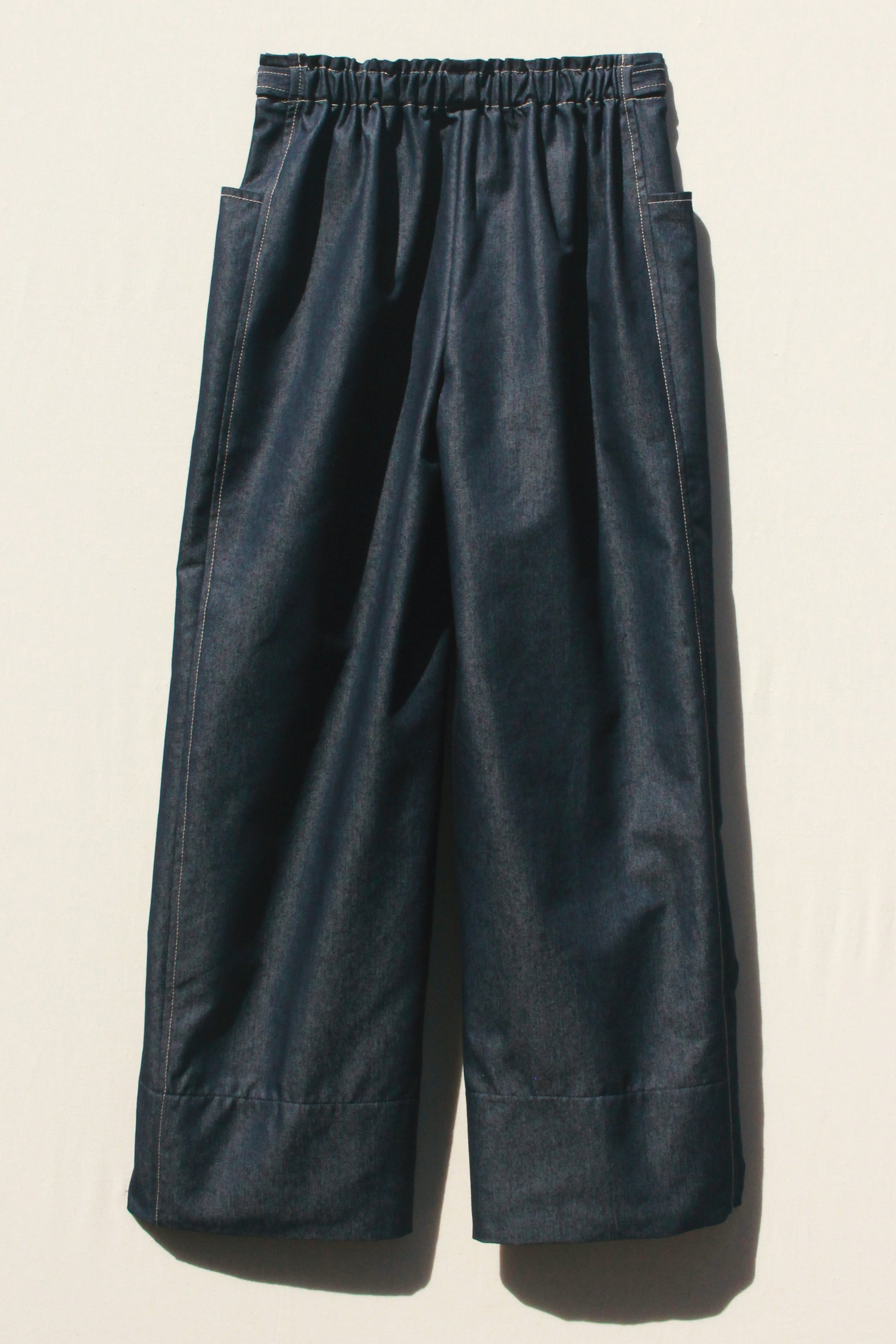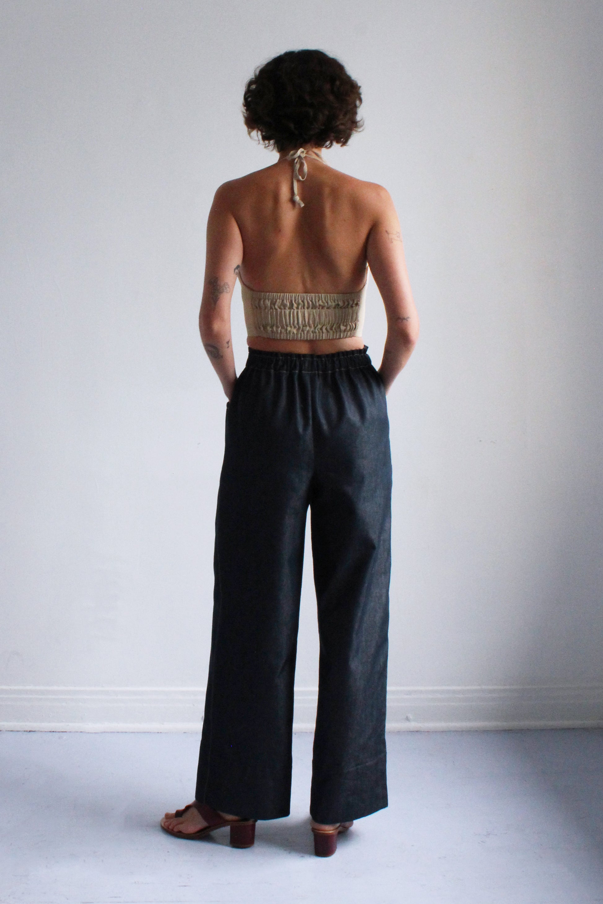 A pant that keeps up with your outfit mood (and perhaps your meal). Featuring a button & tab adjuster at the front waist, tunneled elastic at the back waist, scoop pockets that stand away slightly, a pleat front leg with a center seam, and all over contrast topstitching.
