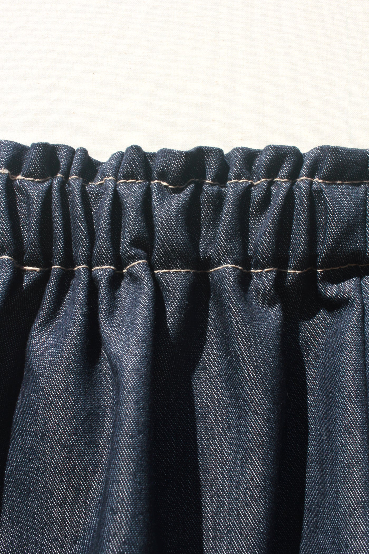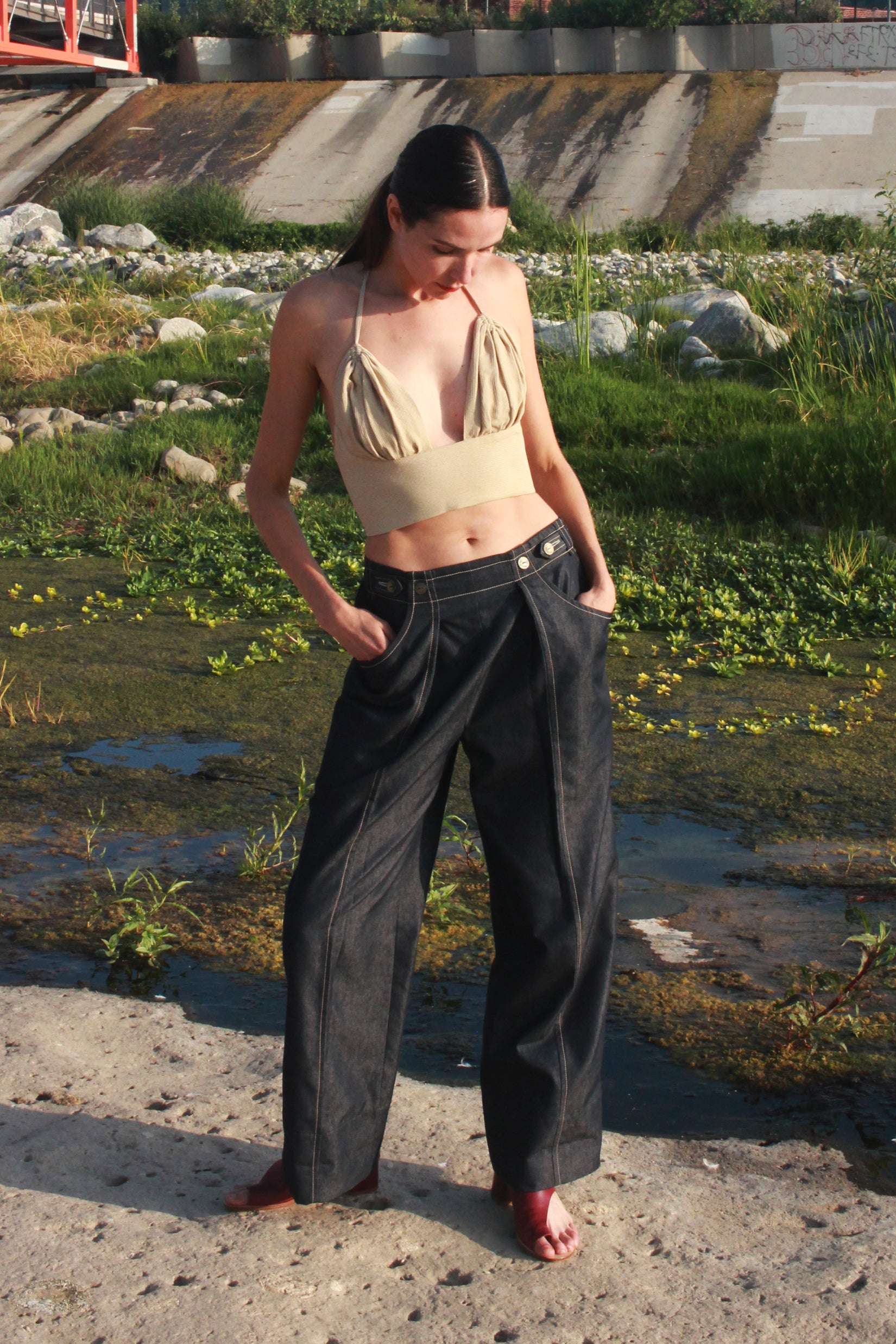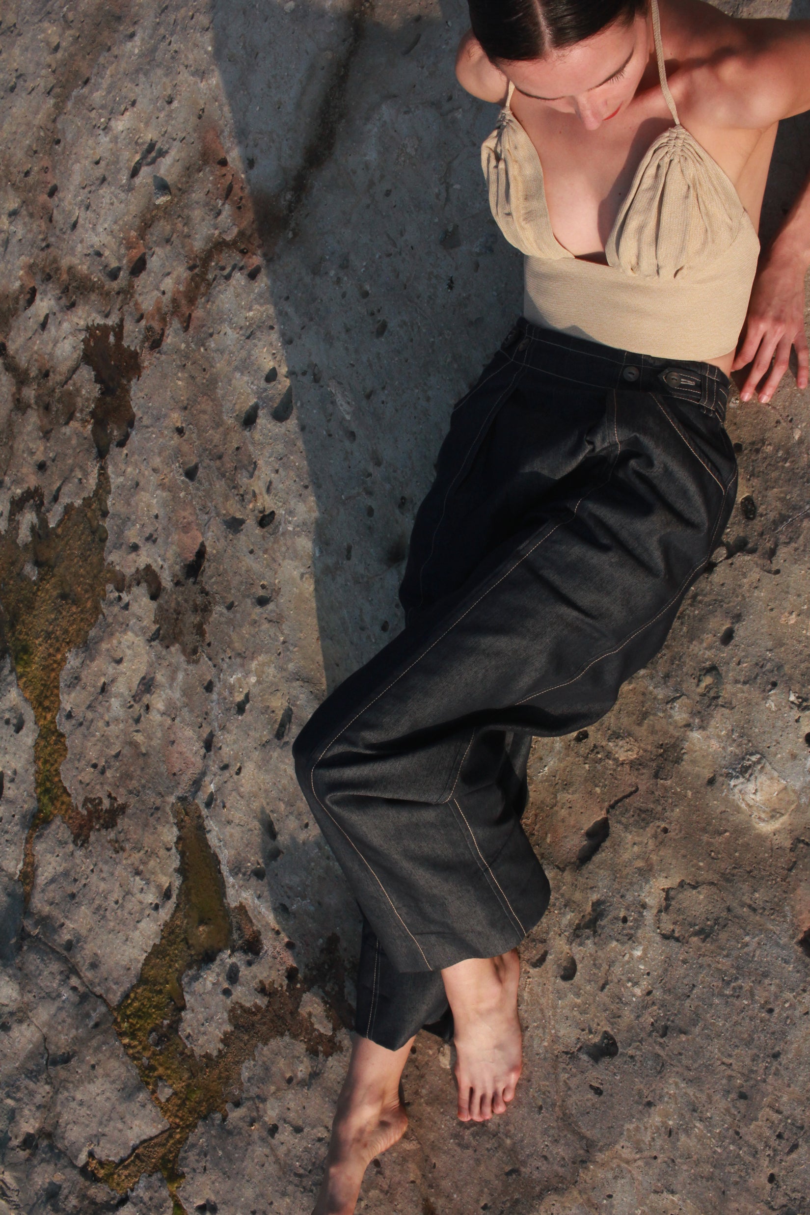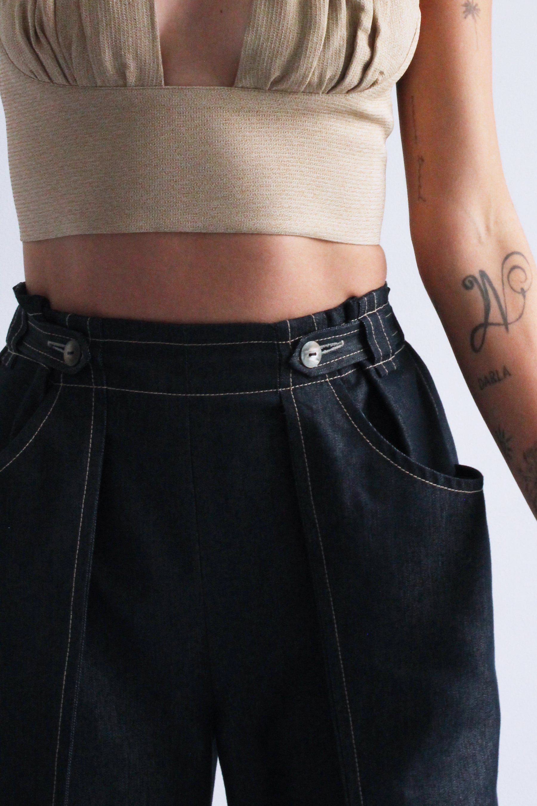 A pant that keeps up with your outfit mood (and perhaps your meal). Featuring a button & tab adjuster at the front waist, tunneled elastic at the back waist, scoop pockets that stand away slightly, a pleat front leg with a center seam, and all over contrast topstitching.