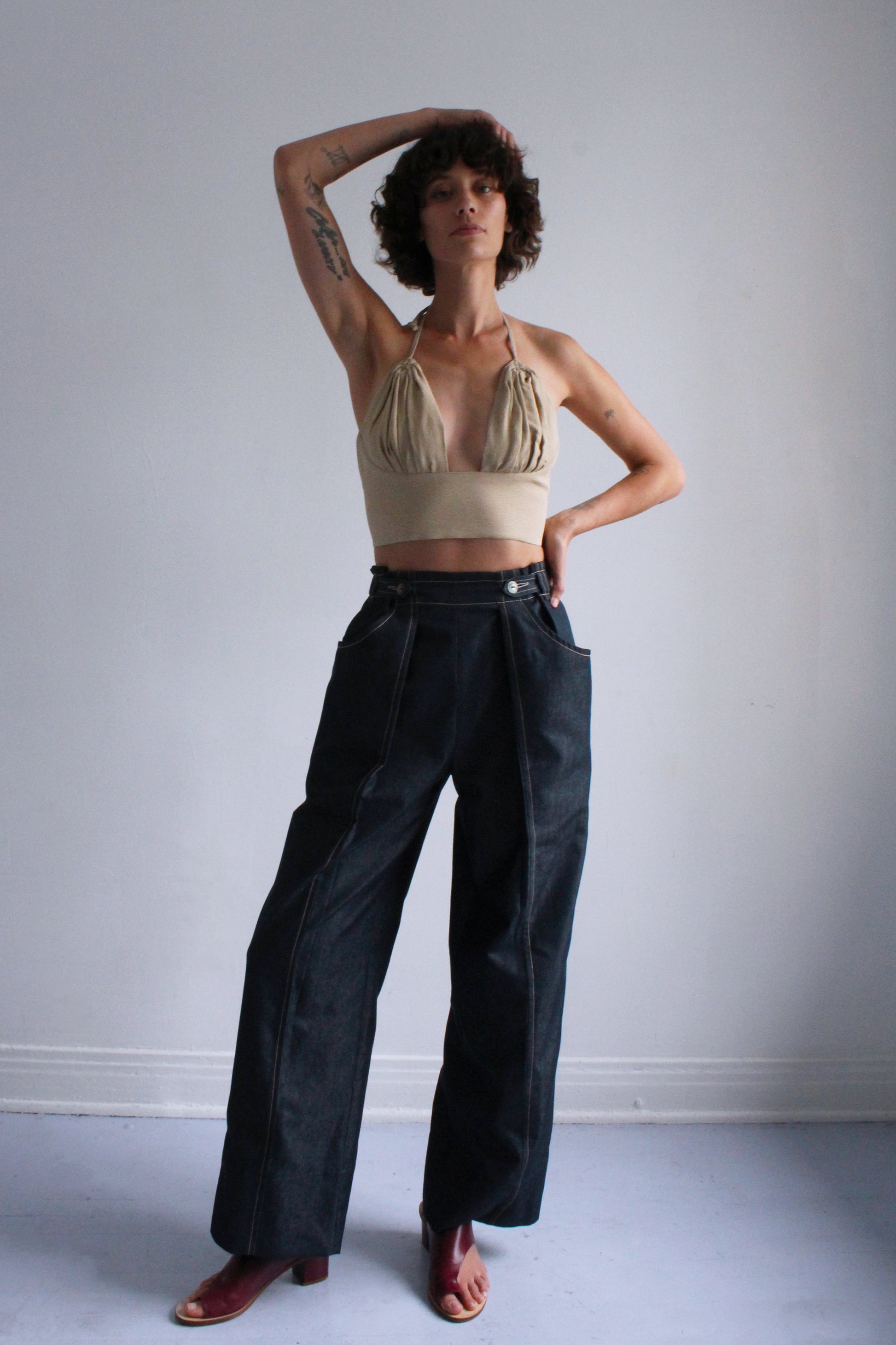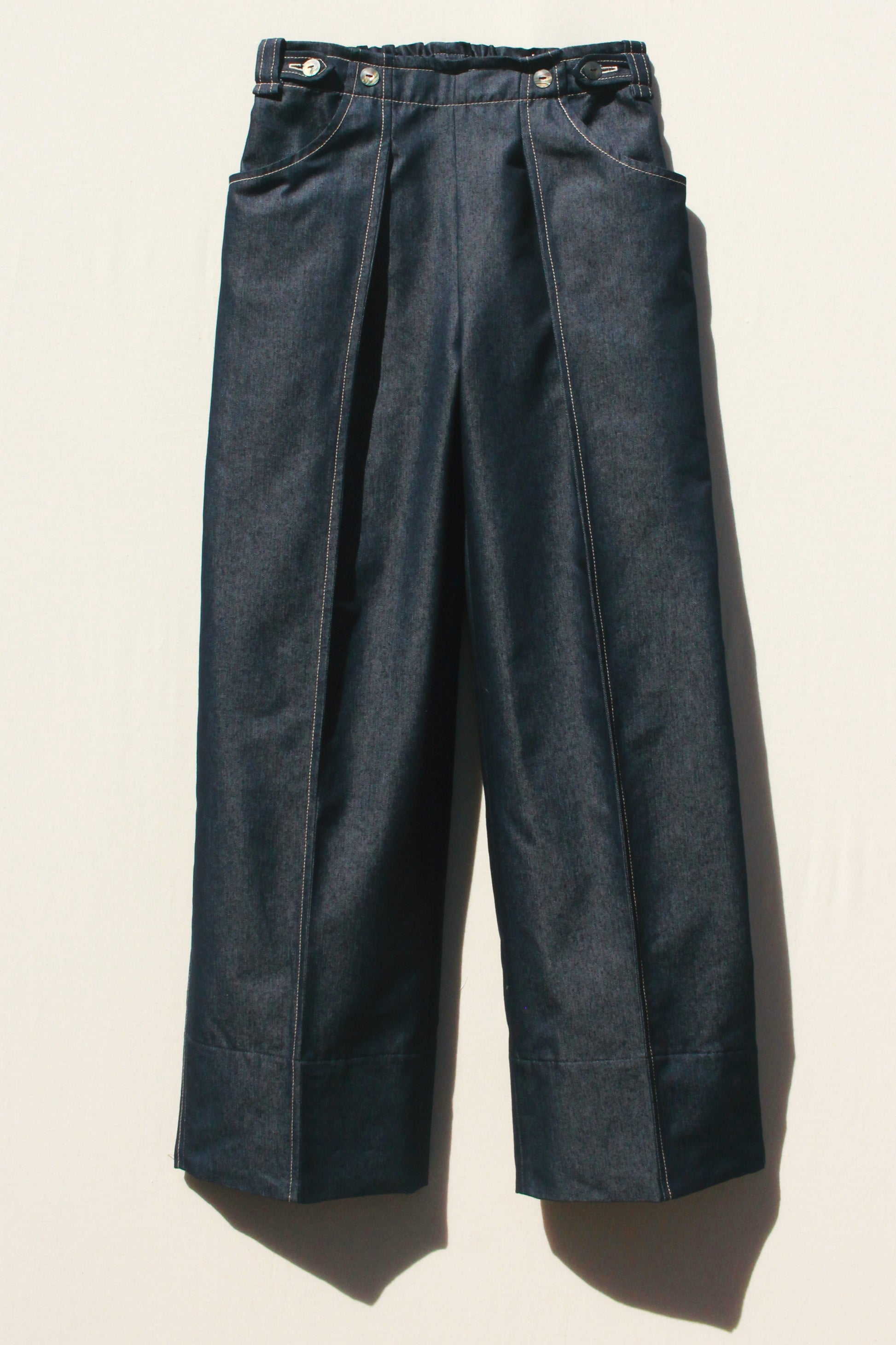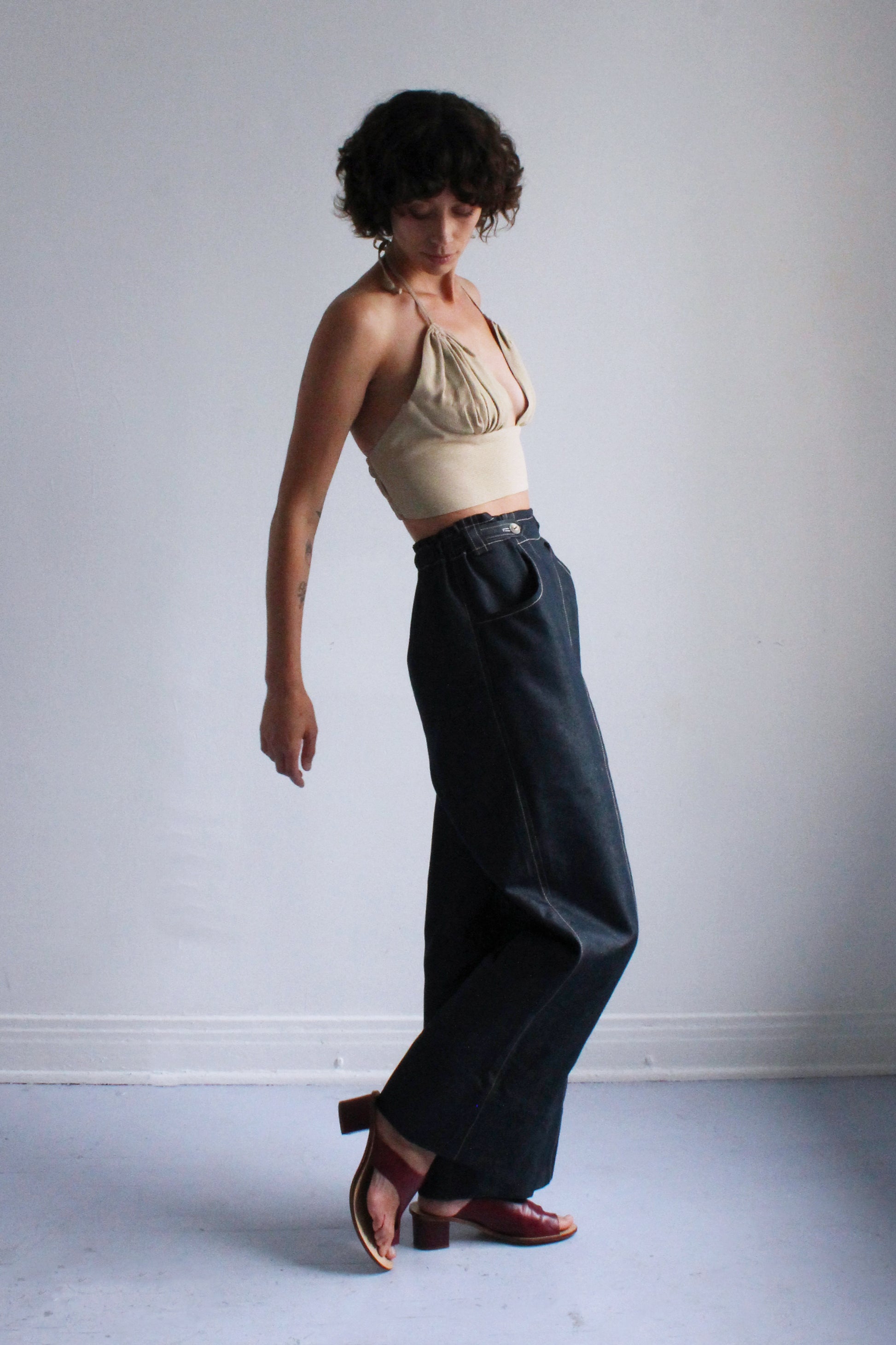 Cut in a lightweight indigo denim. Relaxed/wide leg. Inseam is 30 1/2" (with a 4"+ wide hem for alteration).