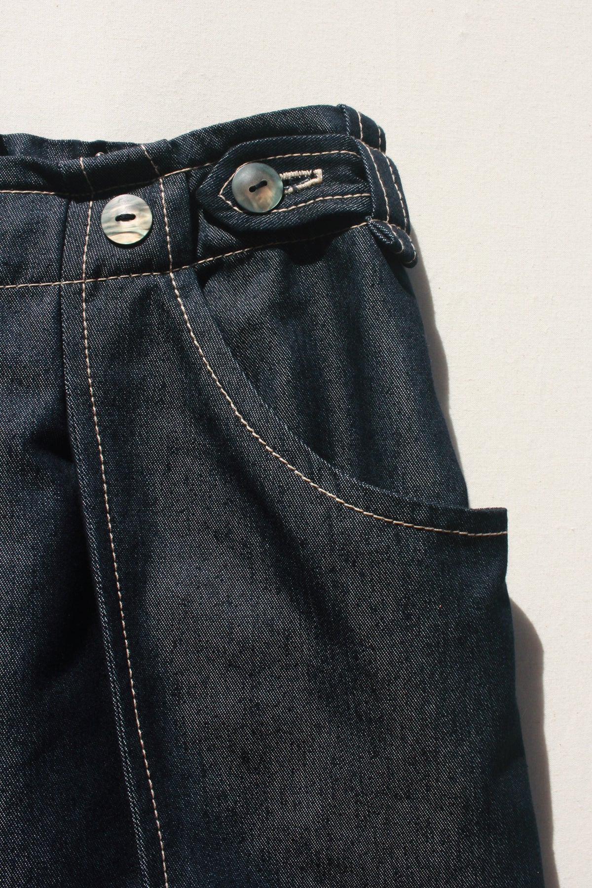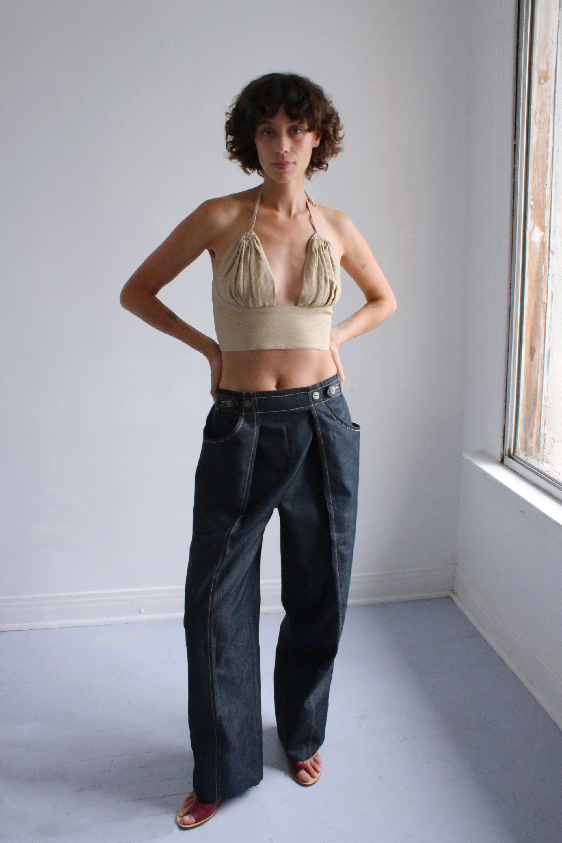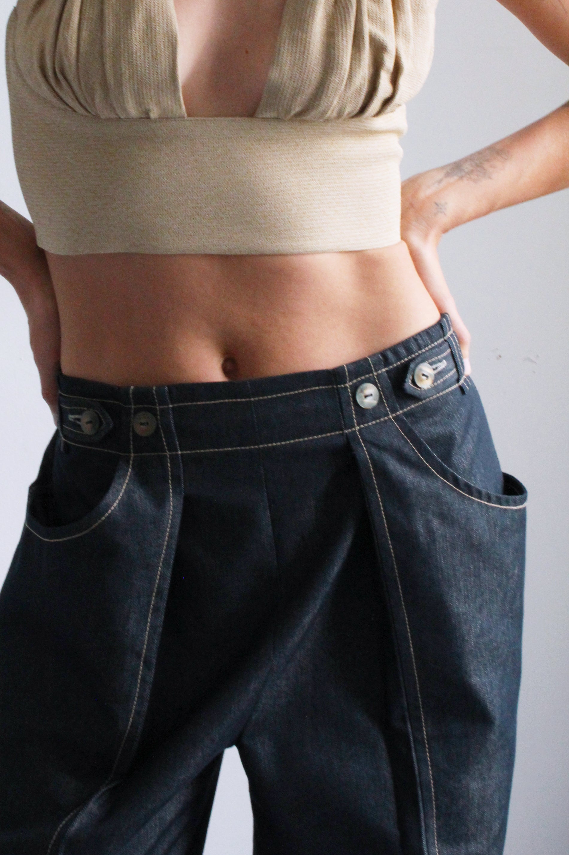 Cut in a lightweight indigo denim. Relaxed/wide leg. Inseam is 30 1/2" (with a 4"+ wide hem for alteration).