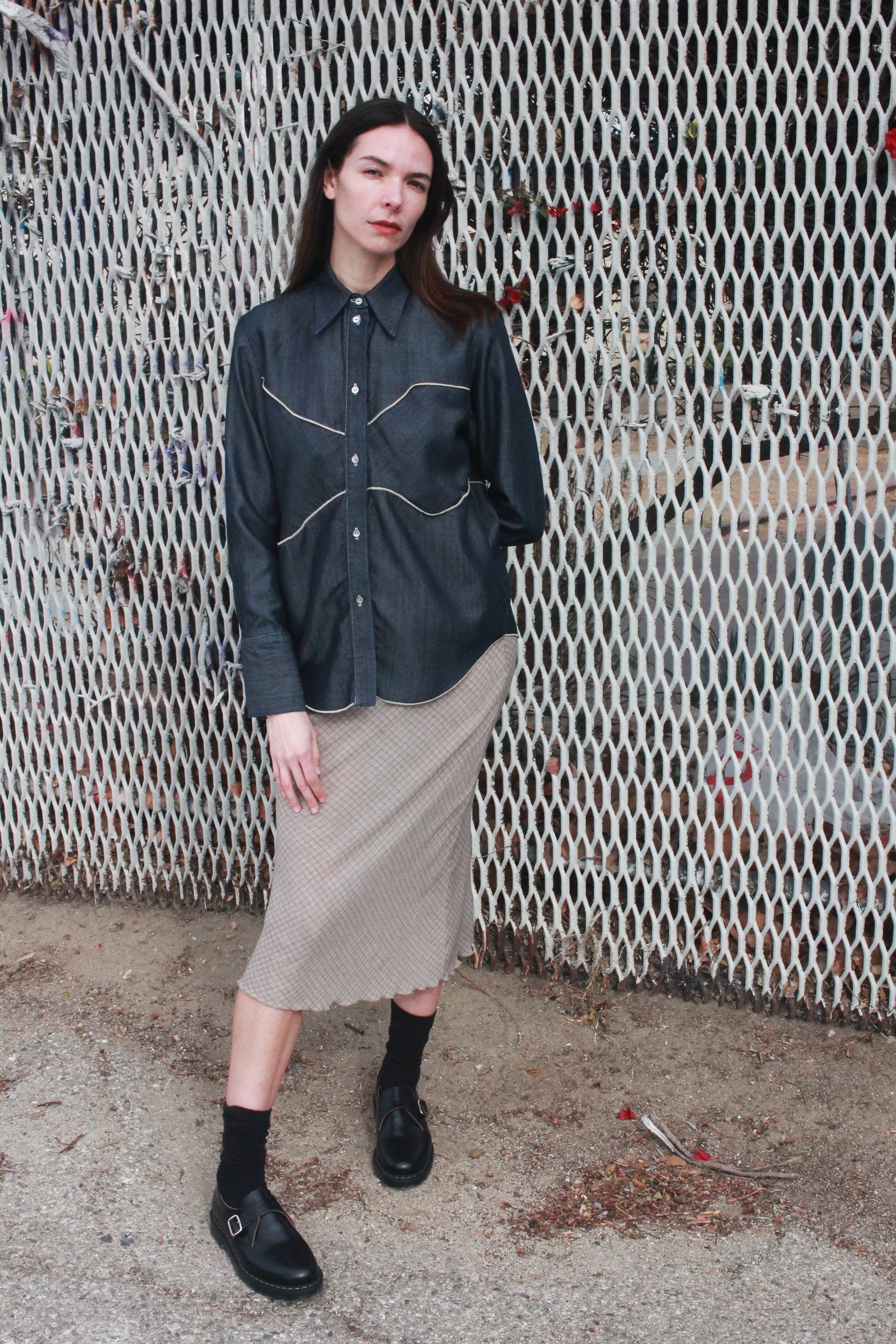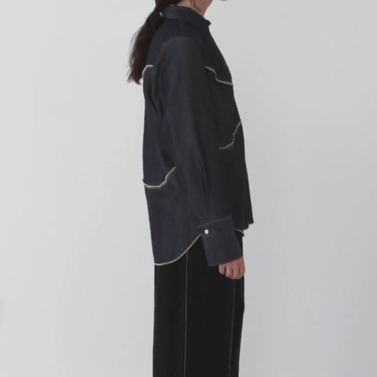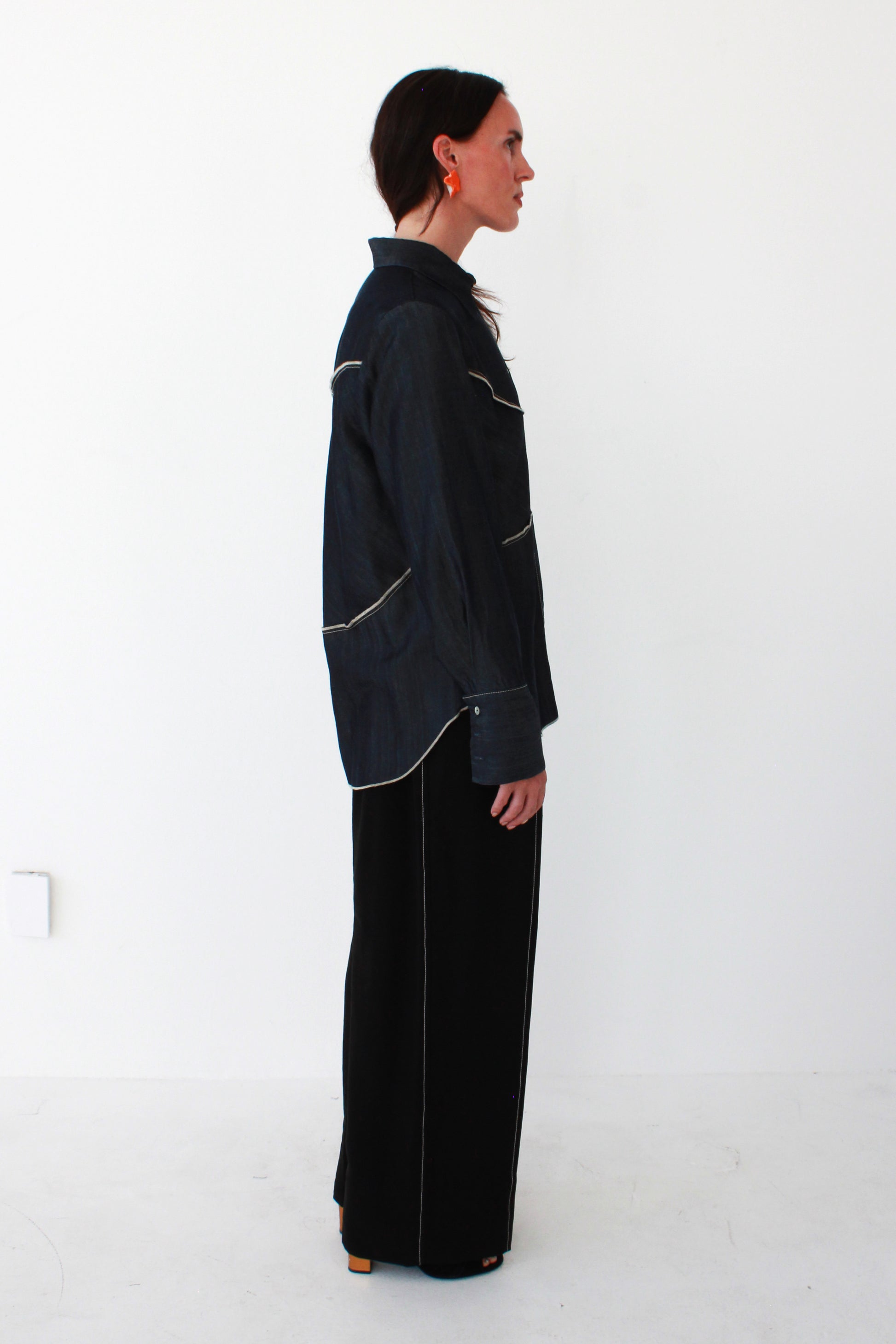 Wandering contrast seams, delicate shell buttons and bold collar and cuff proportions lands us in our favorite realm of minimalist romance. This silhouette is an easy option for everyday wear, while still lending a distinctive feel to your look.